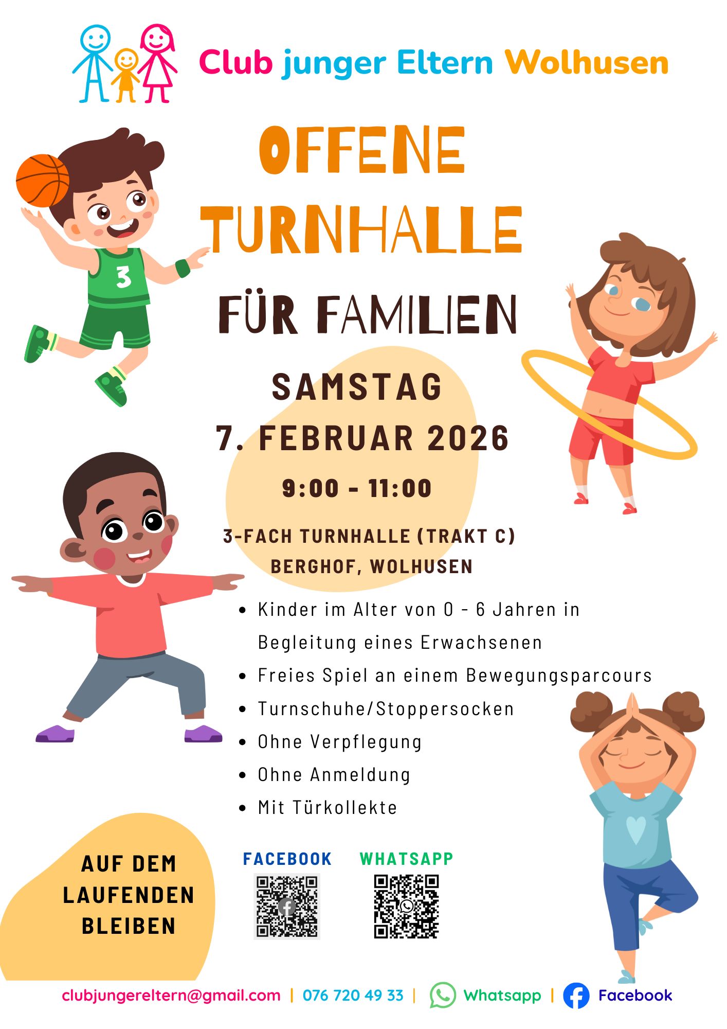 Offene Turnhallen bieten Kindern und ihren Familien die Möglichkeit, sich frei zu bewegen, zu spielen und Spass zu haben. Eine Vielzahl an Sport- und Spielgeräten steht bereit, sodass jede und jeder das Programm selbst gestalten kann.